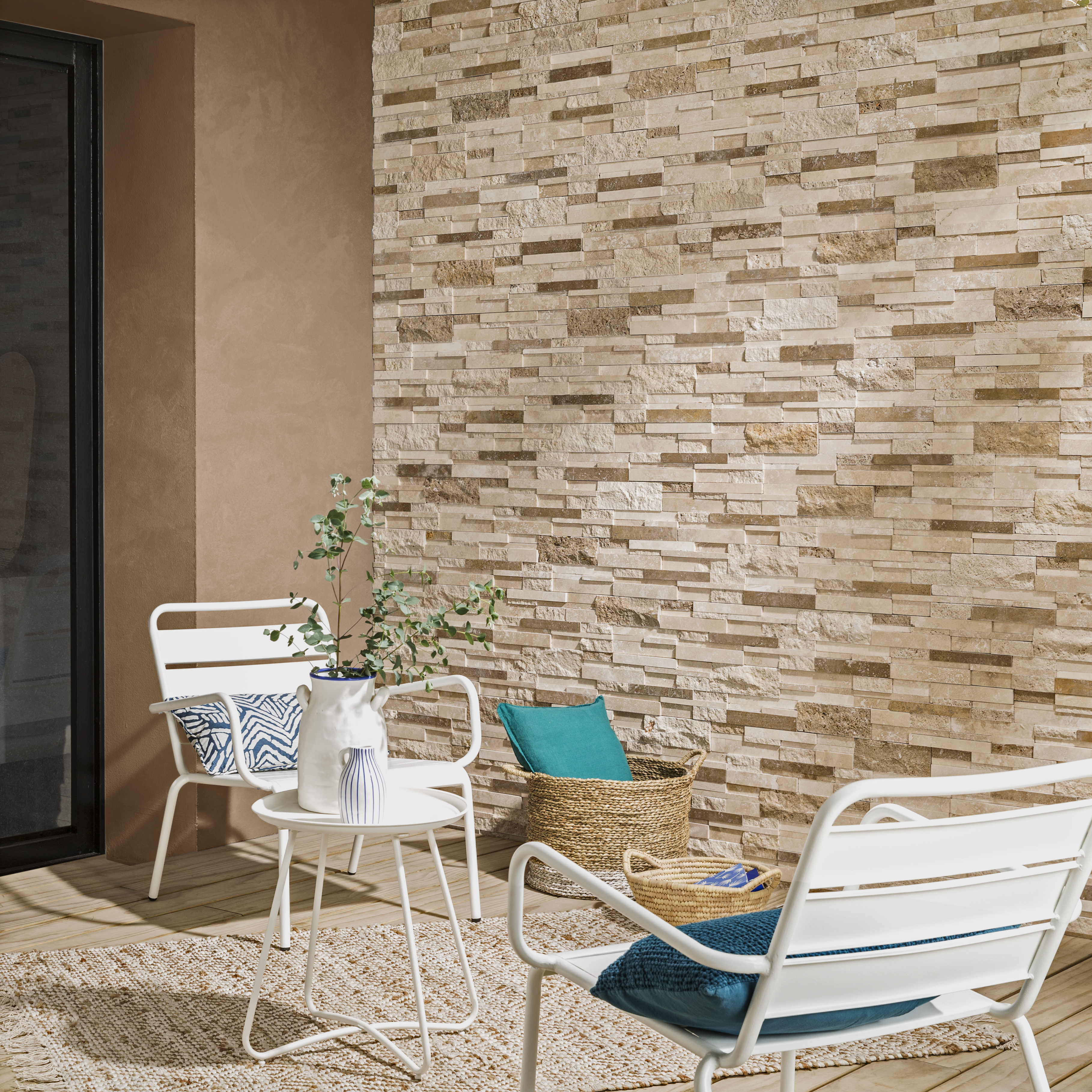 Adapté à l’intérieur comme à l’extérieur, le parement en travertin embellit un mur de salon, une entrée, une salle de bain ou une façade. Son relief et sa texture minérale apportent une profondeur visuelle en vogue.